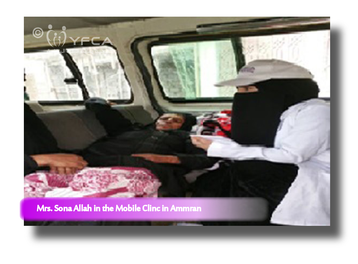 Mr. Sona’ Allah’s husband was informed about the YFCA mobile clinic which is funded by the OCHA as part of the Protection Project in both Ammran and Al Hudaydah. He did not hesitate to rush his wife for any help they can get. The mobile clinic could not define what was wrong with Mrs. Sona’Allah and her situation was rappidly declining therefore, she was referred to Sana’a for an exploratory surgery